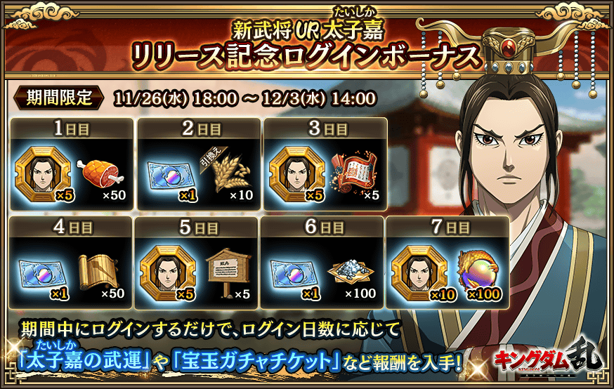 11月26日(水) メンテナンス終了後より、太子嘉リリースを記念してログインボーナスや販売を開催!