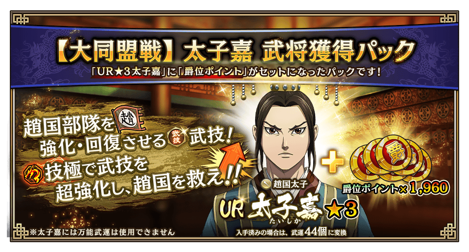 | 【大同盟戦】太子嘉 武将獲得パック | UR★3太子嘉 | 4,900円 |