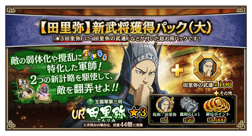 | 【田里弥】新武将獲得パック(大) | UR★3田里弥 田里弥の武運 x100 祝剣:田里弥 x1 龍剣石Lv1 x20 | 10,000円 |