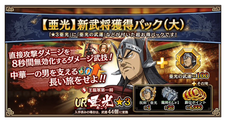| 【亜光】新武将獲得パック(大) | UR★3亜光 亜光の武運 x100 祝剣:亜光 x1 龍剣石Lv1 x20 | 1回 | 10,000円 |