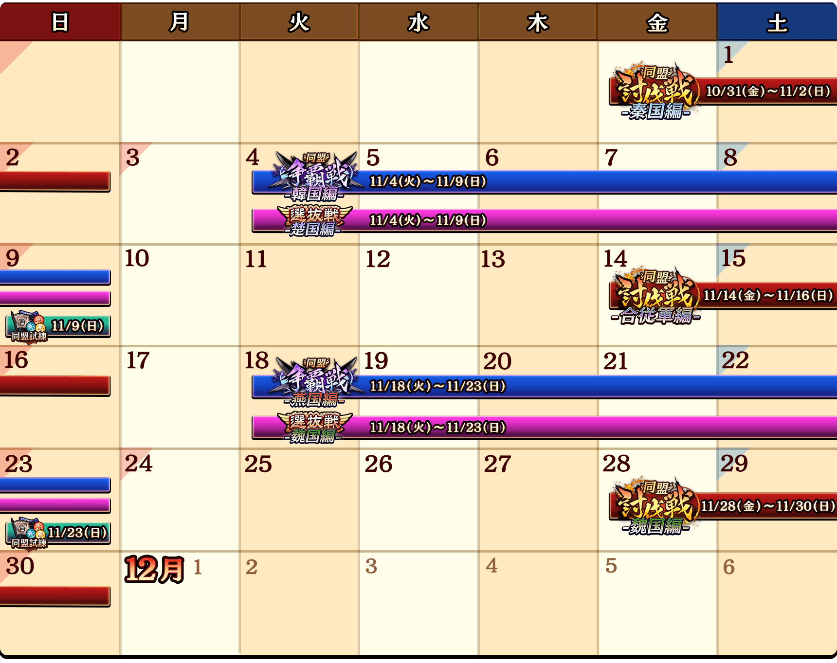 11月の同盟討伐戦・同盟争覇戦・同盟試練スケジュールを公開いたします。
