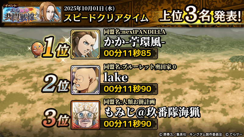 2025年10月1日(水) 14:00に終了した『玉鳳楽華共闘戦線』イベントのスピードクリアランキング結果を発表いたします!