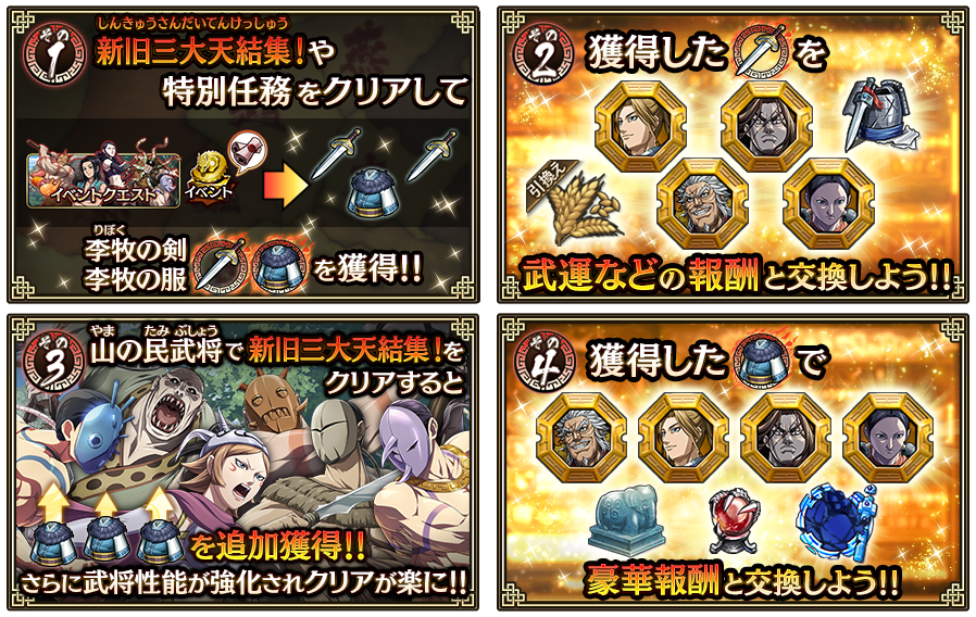 イベントクエスト『新旧三大天結集!』で交換用アイテム『李牧の剣』『李牧の服』を集めて、豪華報酬を獲得しよう!