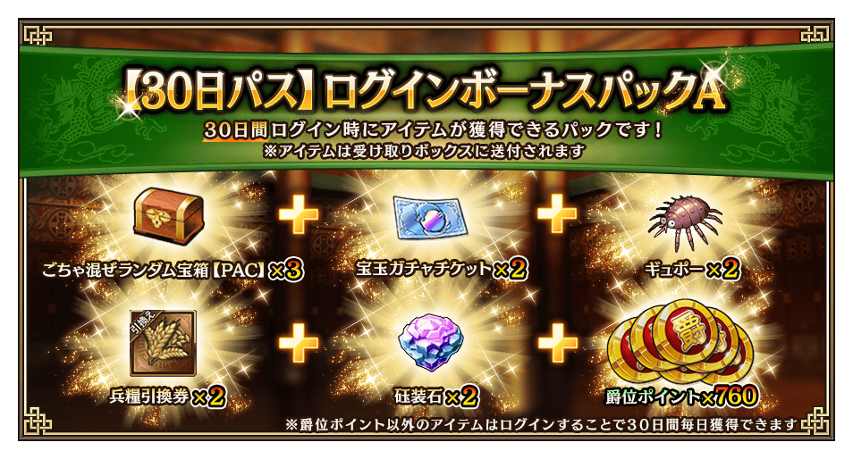 | 【30日パス】 ログインボーナスパックA | ごちゃ混ぜランダム宝箱【PAC】 x3 宝玉ガチャチケット x2 ギュポー x2 兵糧引換券 x2 砡装石 x2 | 1,900円 |