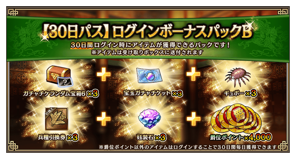 | 【30日パス】 ログインボーナスパックB | ガチャチケランダム宝箱6 x3 宝玉ガチャチケット x3 ギュポー x3 兵糧引換券 x3 砡装石 x3 | 10,000円 |
