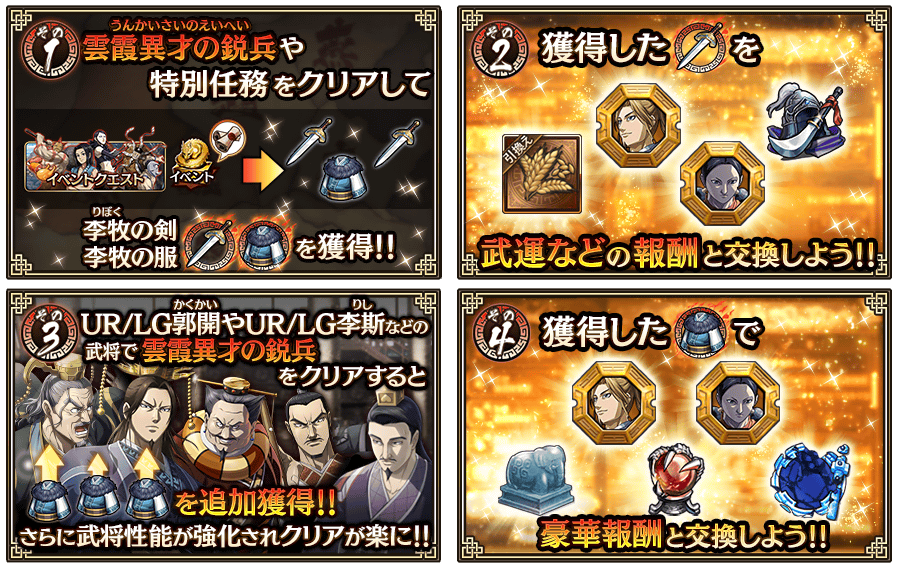 イベントクエスト『雲霞異才の鋭兵』やイベント任務をクリアして『李牧の剣』『李牧の服』を集め、豪華報酬と交換しよう!