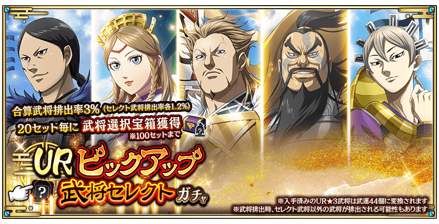 複数のUR武将が排出対象となるセレクトガチャを開催!選んだ武将の排出率を上昇させ、効率よく獲得・強化しよう!※排出率を上昇させたUR武将以外も排出される可能性があります