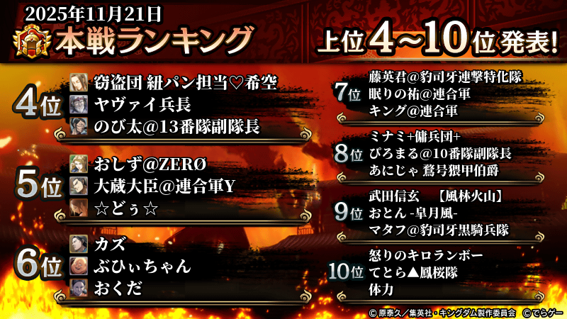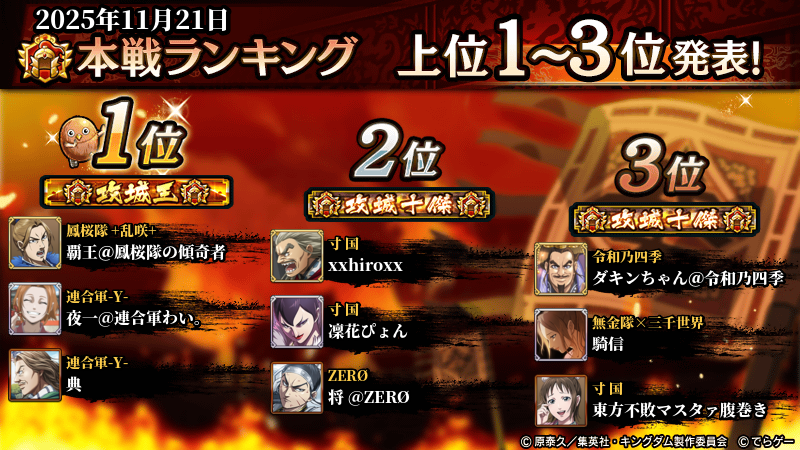 2025年11月21日(金)に開催した攻城戦のランキング結果を発表いたします!