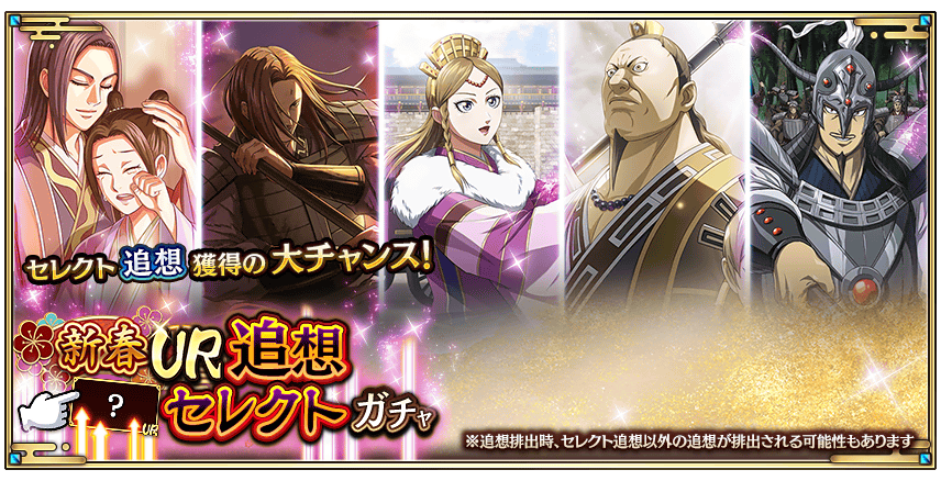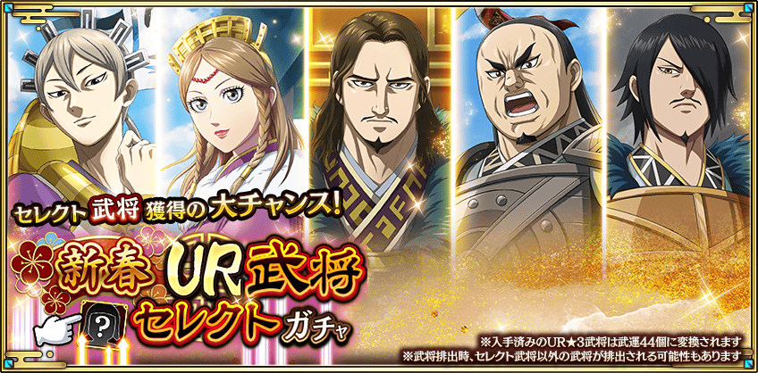 複数のUR武将が排出対象となるセレクトガチャを開催!選んだ武将の排出率を上昇させ、効率よく獲得・強化しよう!※排出率を上昇させたUR武将以外も排出される可能性があります