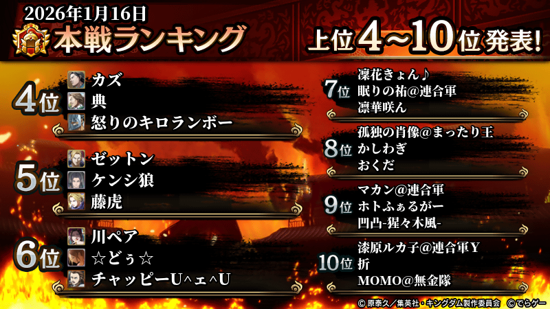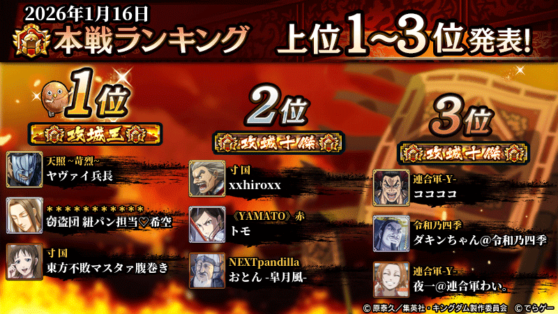 2026年1月16日(金)に開催した攻城戦のランキング結果を発表いたします!