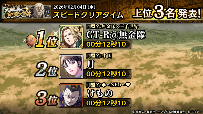 2026年2月4日(水) 14:00に終了した『大地轟く沈黙の巨体』イベントのスピードクリアランキング結果を発表いたします!