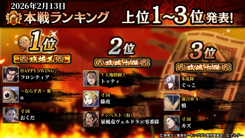 2月13日『攻城戦』ランキング結果発表