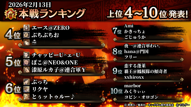 2026年2月13日(金)に開催した攻城戦のランキング結果を発表いたします!