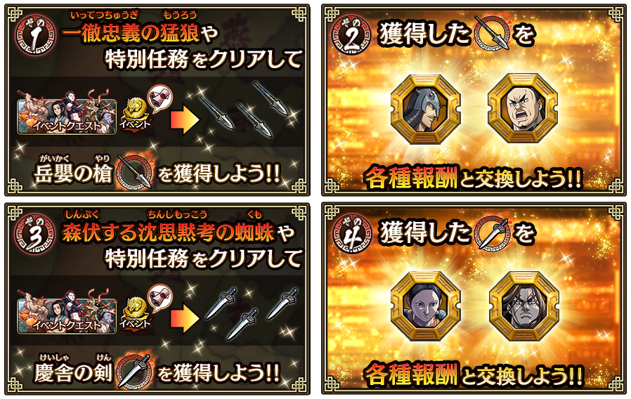 イベントクエスト『一徹忠義の猛狼』『森伏する沈思黙考の蜘蛛』やイベント任務をクリアして『岳嬰の槍』『慶舎の剣』を集め、豪華報酬と交換しよう!
