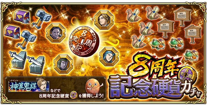 | 叡智名将の塁壁布陣 | 上級~ 新三大天級 | ![]() 8周年記念硬貨 | ![]() ![]() 8周年記念硬貨 または 貨幣 |