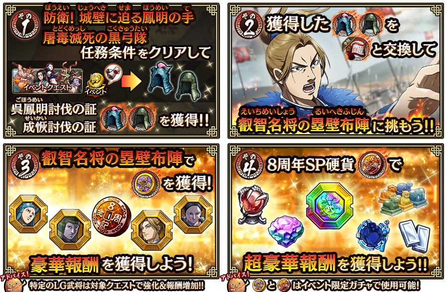 | LG汗明 LG臨武君 LG考烈王 LG李園 LG項翼 LG白麗 | 追加ドロップ効果 | 『8周年記念硬貨』もしくは『貨幣』追加ドロップ効果が発動 | ドロップ効果はありません |