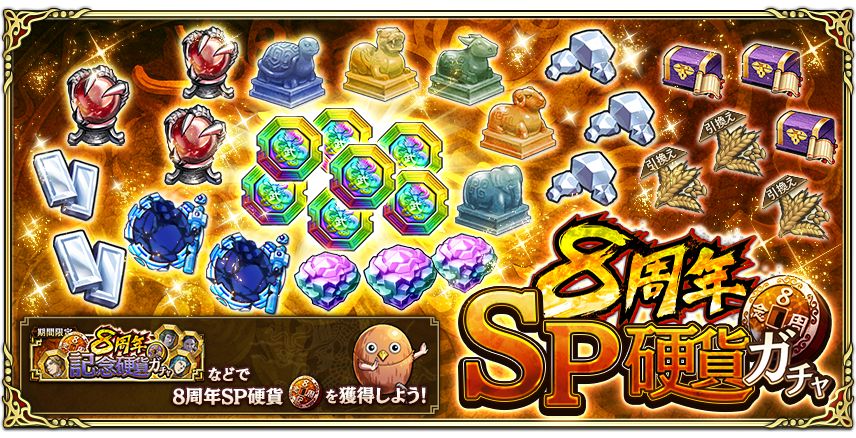 『8周年記念硬貨ガチャ』から獲得できる『8周年SP硬貨』で、より報酬が豪華な『8周年SP硬貨ガチャ』を引くことができます!