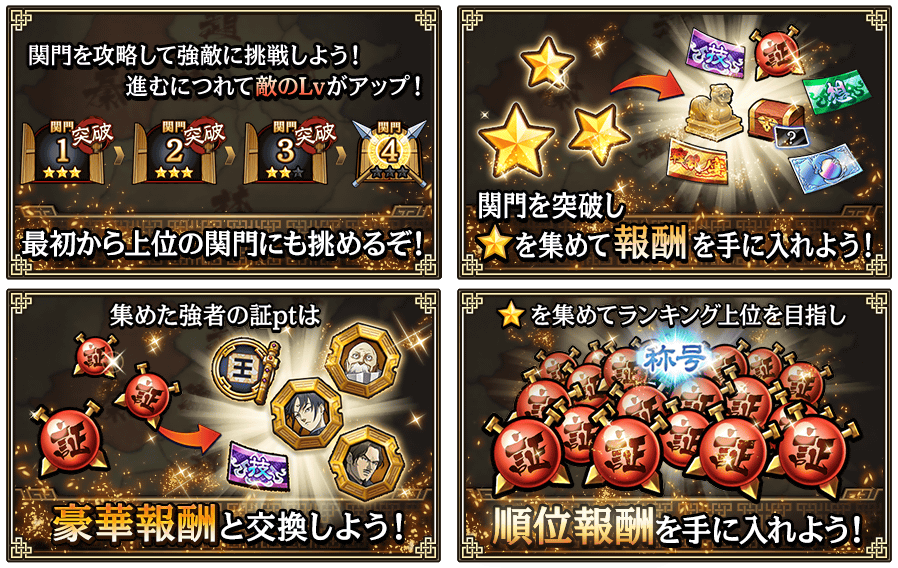 ※『強者の証ポイント』枠を追加購入(各500宝玉×最大2枠)することで、各関門の初回クリア報酬にさらに『強者の証ポイント』のドロップを追加できます