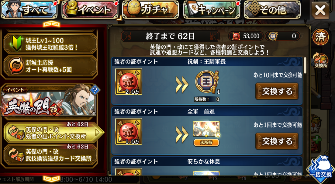 『武技換装追想カード』、様々なガチャチケットや『ガチャチケランダム宝箱【英傑】』が獲得できます。