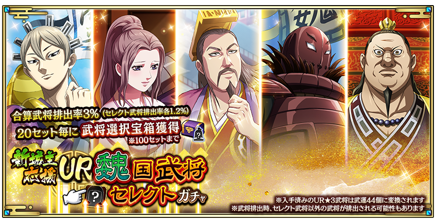魏国の精鋭を狙え!複数の魏国武将が排出対象となるセレクトガチャを開催!選んだ武将の排出率を上昇させ、効率よく獲得・強化しよう!※排出率を上昇させたUR武将以外も排出される可能性があります