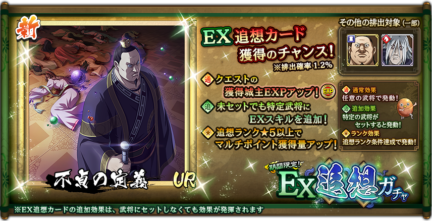 排出される新追想カード『不貞の定義』は、獲得することで対象武将に新たなEXスキルが解放される『EXスキル追加追想カード』です!