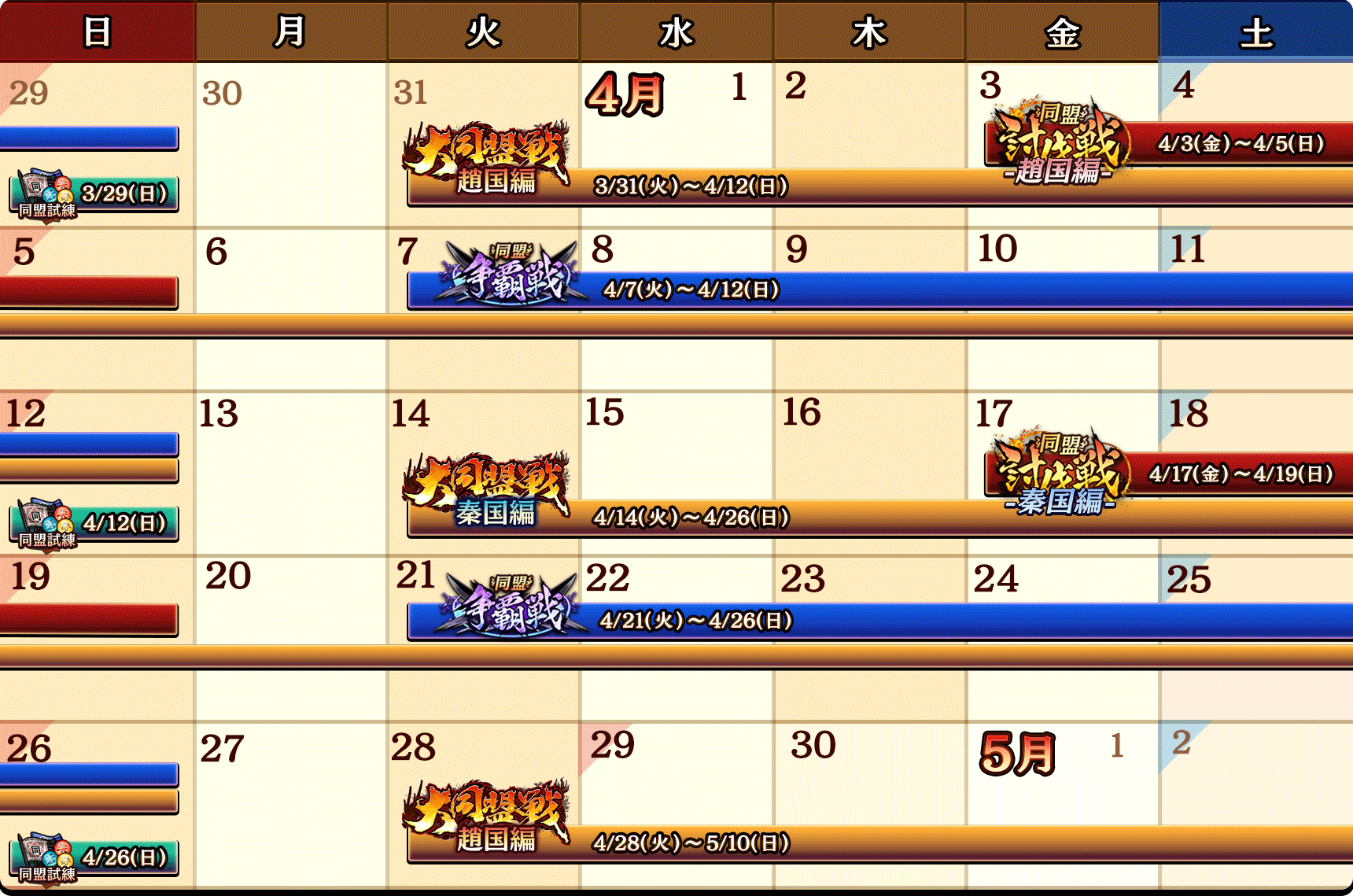 4月の大同盟戦・同盟討伐戦・同盟争覇戦・同盟試練の開催スケジュールを公開いたします。
