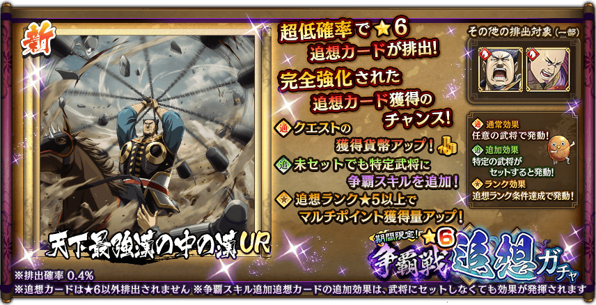 排出される新追想カード『天下最強漢の中の漢』は、獲得することで対象武将に新たな争覇スキルが解放される『UR争覇スキル追加追想カード』です!