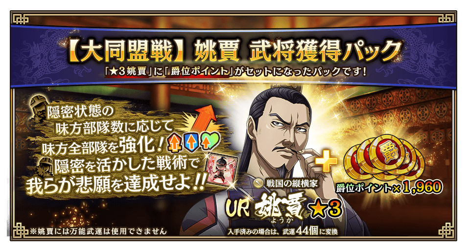 | 【宝玉】大同盟戦 姚賈 武将獲得パック | UR★3姚賈 | 5,000宝玉 |