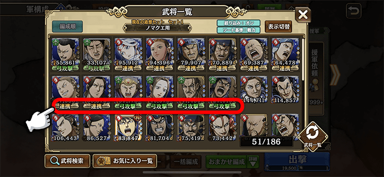 ③『裏技極』のUR京令を特定武将の副将に編成する。