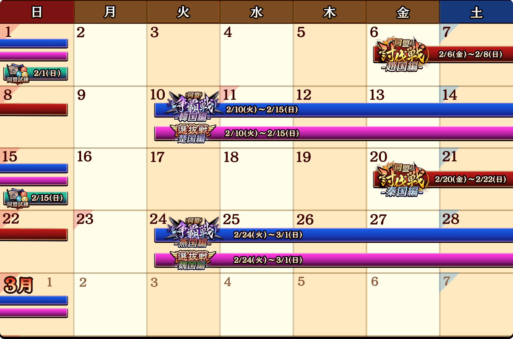 2月の同盟討伐戦・同盟争覇戦・同盟試練スケジュールを公開いたします。