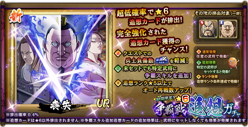 ※対象の武将を援軍に編成して出撃した場合大将/副将も対象となります