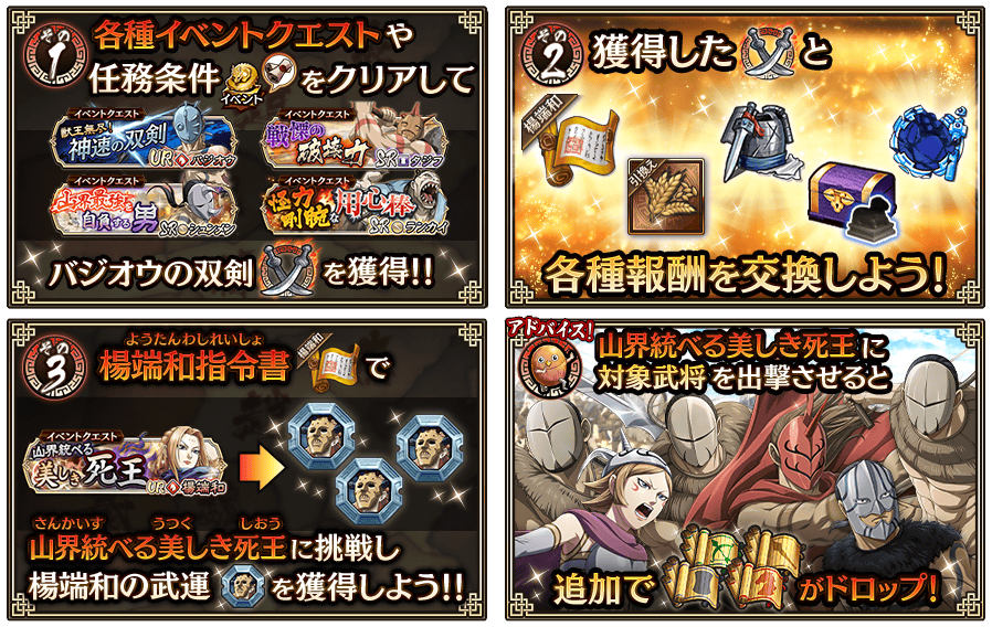 ⇒期間中、イベントクエストを一定回数クリアすると『宝玉』『討伐書』『討伐戦イベント宝箱【秦】』などを獲得できます。
