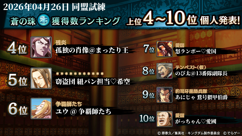 2026年4月26日(日) に終了した『同盟争覇戦』の上位グループのランキング結果を発表いたします!